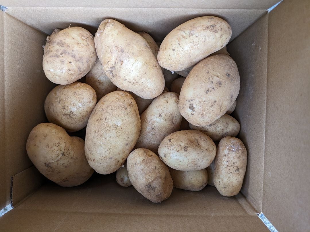畑で採れたてのジャガイモを選んで箱詰めしています